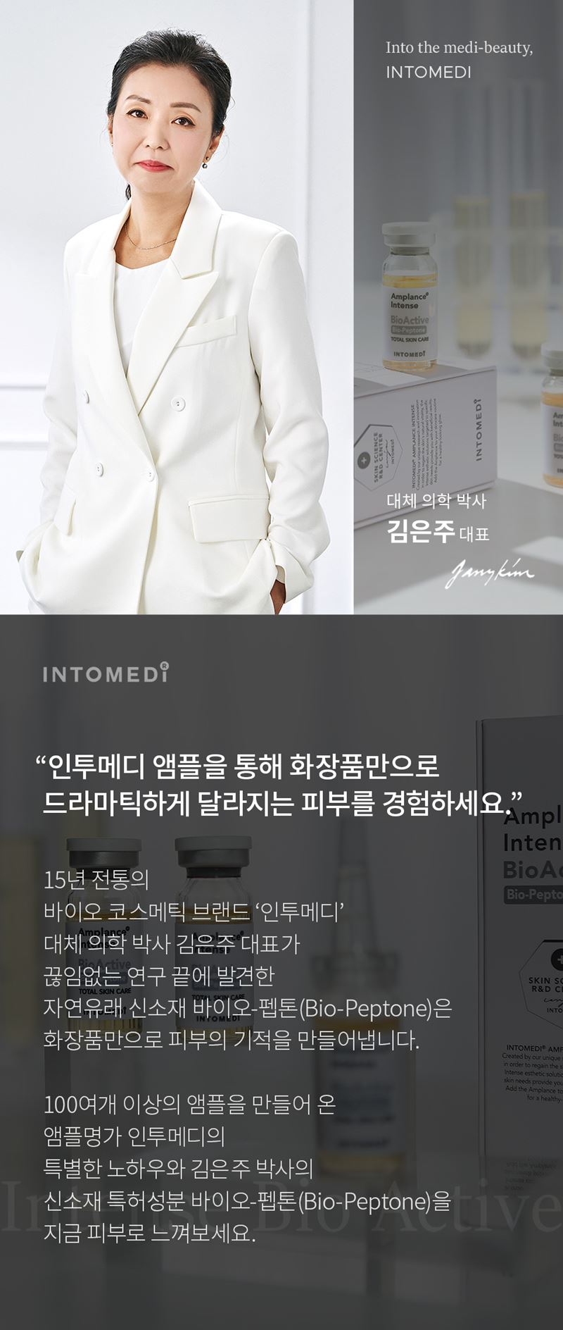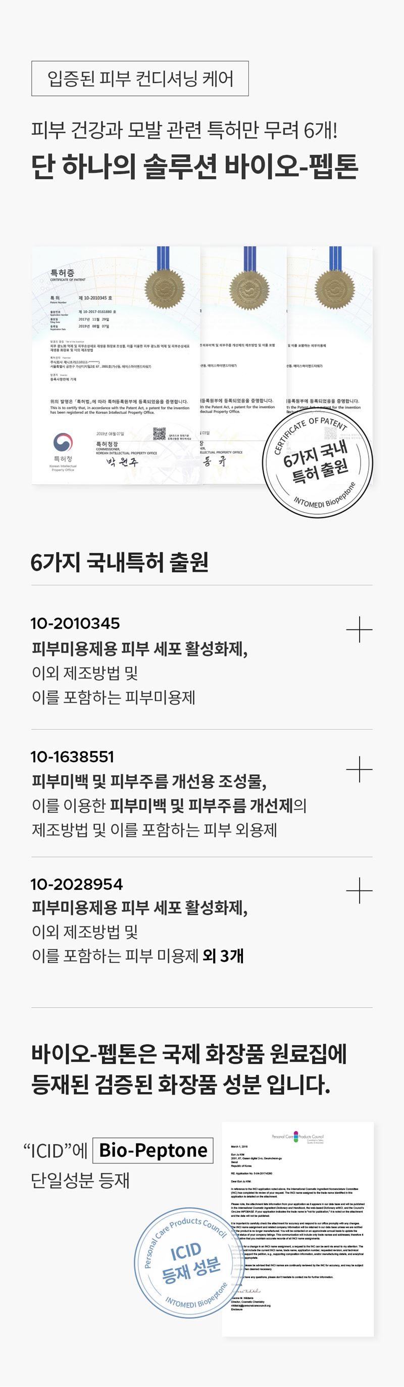- 피부 미백 & 주름개선, 탄력 강화 : 바이오-펩톤® 특허 성분, EGF & FGF(피부세포성장인자), AHP(보톡펩타이드), 나이아신아마이드(VB3), 아데노신