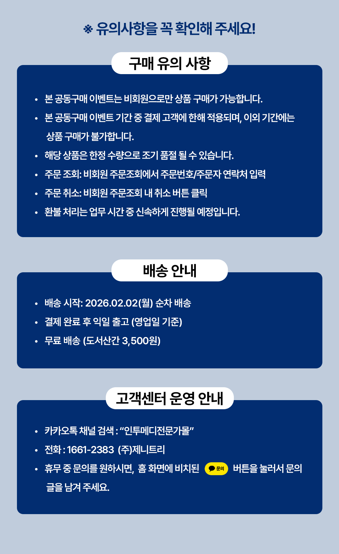 | 배송기간 | - 입금확인 후 2~3일 이내 배송 (토,일,공휴일 제외). 도서산간지역은 7일 이내 배송됩니다. (단, 물류 사정에 따라 다소 차이가 날 수 있습니다.) | |