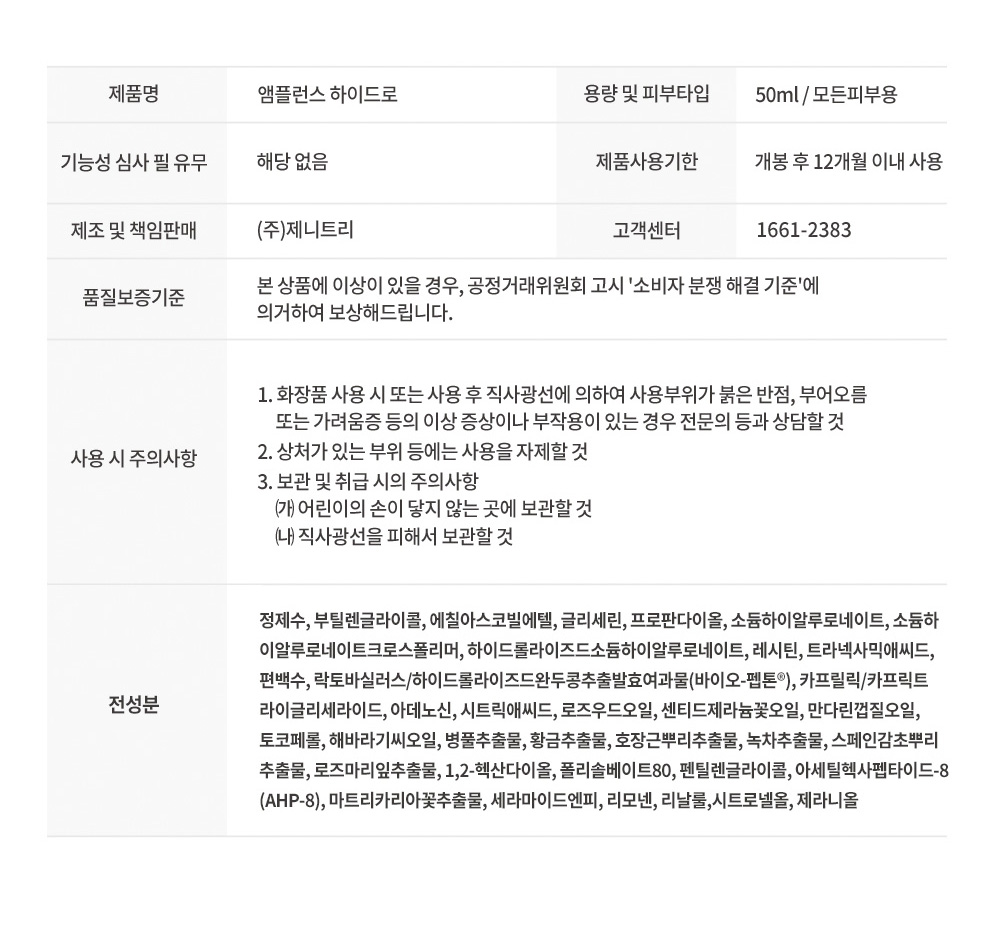 - 수분 집중 공급 및 저장 : 히알루론산 2종, 콜라겐, 글리세린, 세라마이드, 판테놀(VB5), 베타-글루칸
