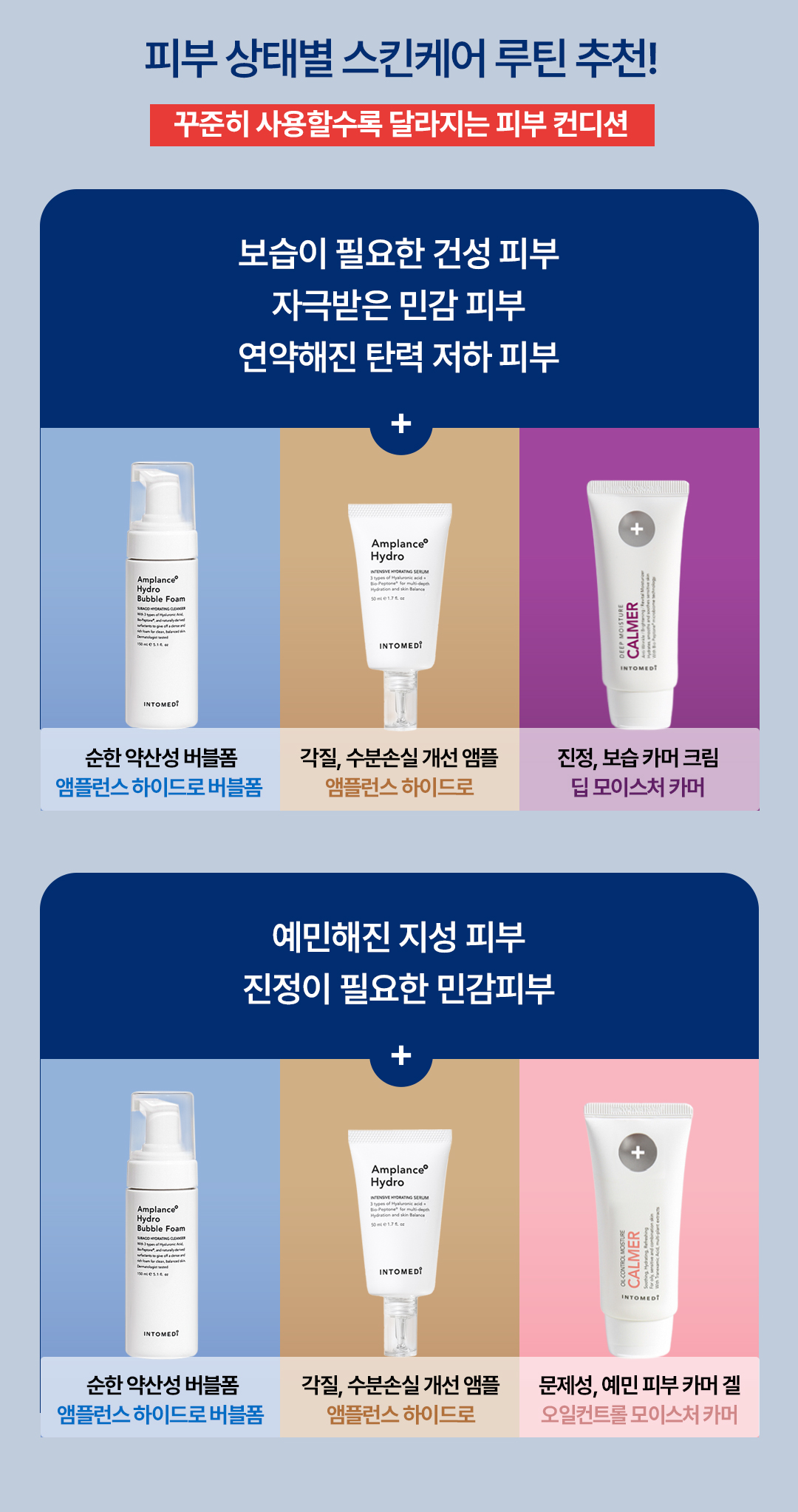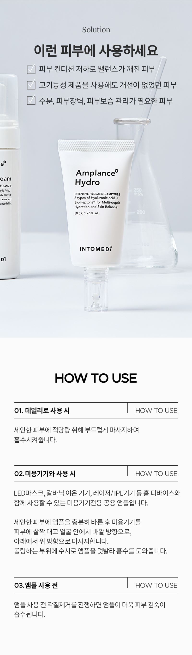 [딥 모이스처 카머, 오일-컨트롤 모이스처 카머] 적당량을 덜어 피부에 골고루 펴 바른 후 흡수시켜 줍니다. [앰플런스 하이드로 버블폼] 적당량을 펌핑하여 얼굴 등에 골고루 마사지하듯 충분히 문지르고 미온수로 깨끗이 헹구어 냅니다.